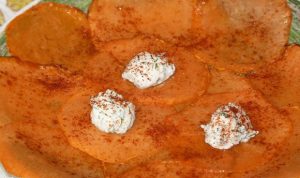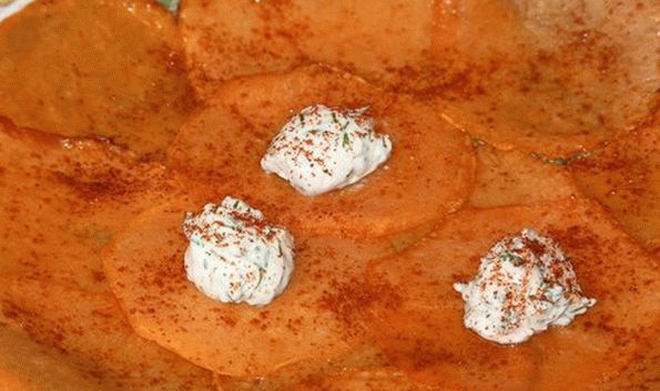 - Приликом сервирања, сирну смешу ставите на чипс, поспите паприком.