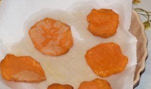 - Осушите бундеву, уваљајте у хлебне мрвице, пржите на јакој ватри две стране. Распоредите на убрус, исциједите вишак уља.