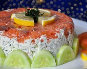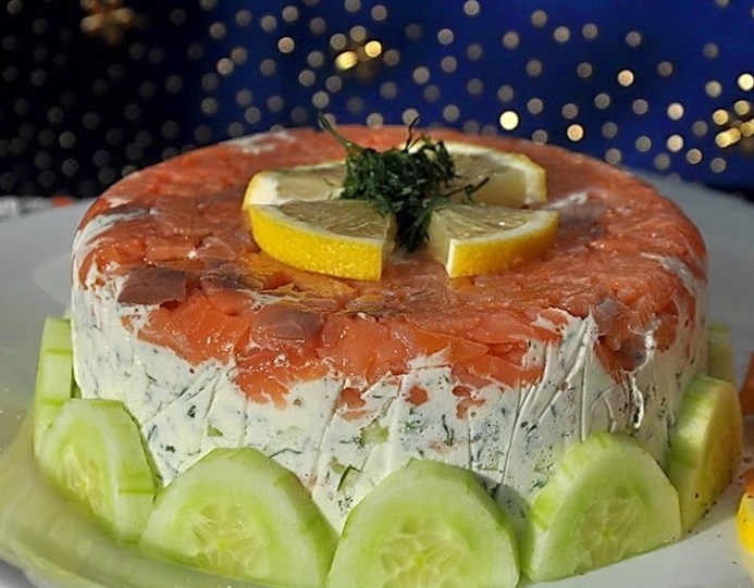 Врло лепа и укусна погача за ужину може се припремити код куће од сланог лососа, свежег краставца, копра, лука, желатине и павлака. Постаће украс свечаног стола.