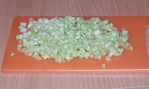Огулите свеже краставце и исеците их на мале коцкице, копар са луком – ситно.