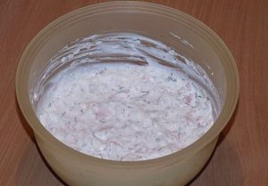 У посуди размажемо коцкице краставаца, остатке лососа, лук и копар.