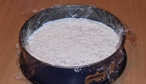Излијте припремљену смешу од киселе павлаке, рибе и краставца у калуп на комаде лососа, поклопите и пошаљите у фрижидер на 8 сати.