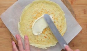 Сваку палачинку намажите крем сиром, намажите и изравнајте пуњење. Последњи слој треба да буде палачинка.