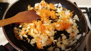 - Огулите и нарезајте лук, мркву и бели лук нарибајте решетке. Пржите у биљном уљу, мешајући.