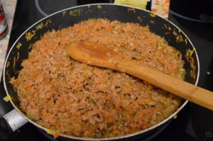- Додајте млевено месо у таву са поврћем (свињетина или говедина) ваше дискреционо право) и паста од парадајза. Пржите још 5 минута.