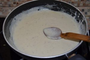 - Узми посуду или дубоку тепсију (по могућности дебелу дно). Отопите путер. Додајте млеко. Постепено додајте брашно, непрестано мешајући. Кувати 10 минута пре згушњавања сос. Додајте мушкатни орашчић. Промените.