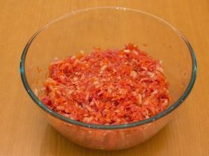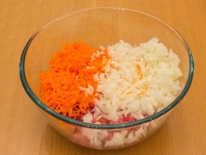 - У чинији комбинујте млевено месо са пиринчем, додајте сецкани лук, шаргарепа, као и со, бибер, добро измешајте.