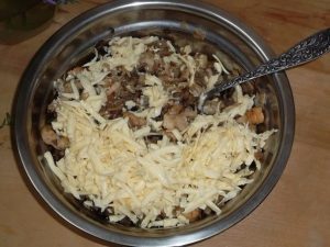 - Пржени надјев ставите у посуду, оставите да се охлади, сипајте сира, посолите и измешајте.