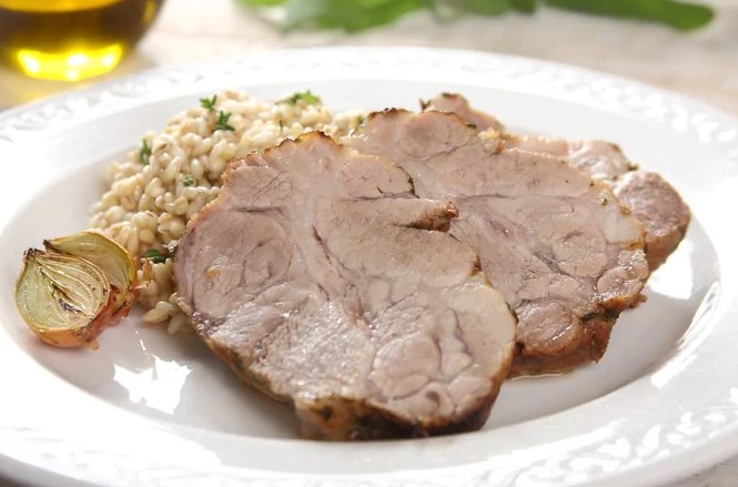 Извадимо мирисни свињски врат, оставимо га у фолији 10 минута, исећи и одмах сервирати.