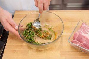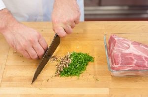 Свињски врат оперемо, натрљамо сољу. Першун и сушени шампињоне ситно насецкати. Пећницу ставимо на 180 степени.