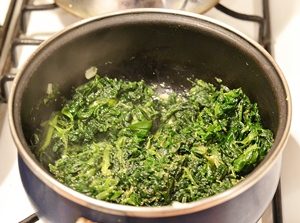 - У шерпици загрејте маслиново уље на минималној топлоти, додајте смесу белог лука и загревајте 20-30 секунди. Додај шпината, повећајте топлоту и кувајте док практично не испари сву течност.