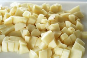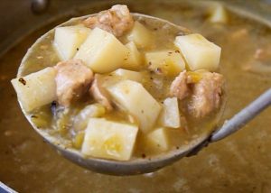 Огулите кромпир, исеците на коцкице и поспите месом лук. Сипајте у воду или чорбу тако да течност буде потпуно прекрива кромпир с месом, поклопите и пирјајте на лаганој ватри 45 минута.