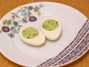 - Ставите јаја на ватру, ставите да прокуха, кувајте још десет минута, охладите у хладној води, огулите, исеците по дужини на два делови. Одвојите жуманце од протеина и уситните.