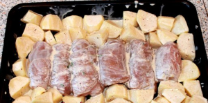 - Можете ставити и комад сланине или шунке. Солим и бибер Завијте у ролну.