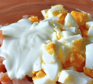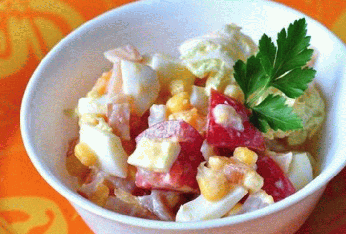 Салату не препоручујемо зачинити мајонезом, боље је кувати Код куће, ово је необично пуњење горива које је описано у наставку. Она је нагласи складан укус салате. Унапријед скухајте пилећа јаја и охладите их. Тада се салата може направити за само 10 минута.
