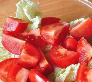 - Кинески купус грубо нарежемо, а парадајз нарежемо на кришке. Ми смо унутра посуда за салату.