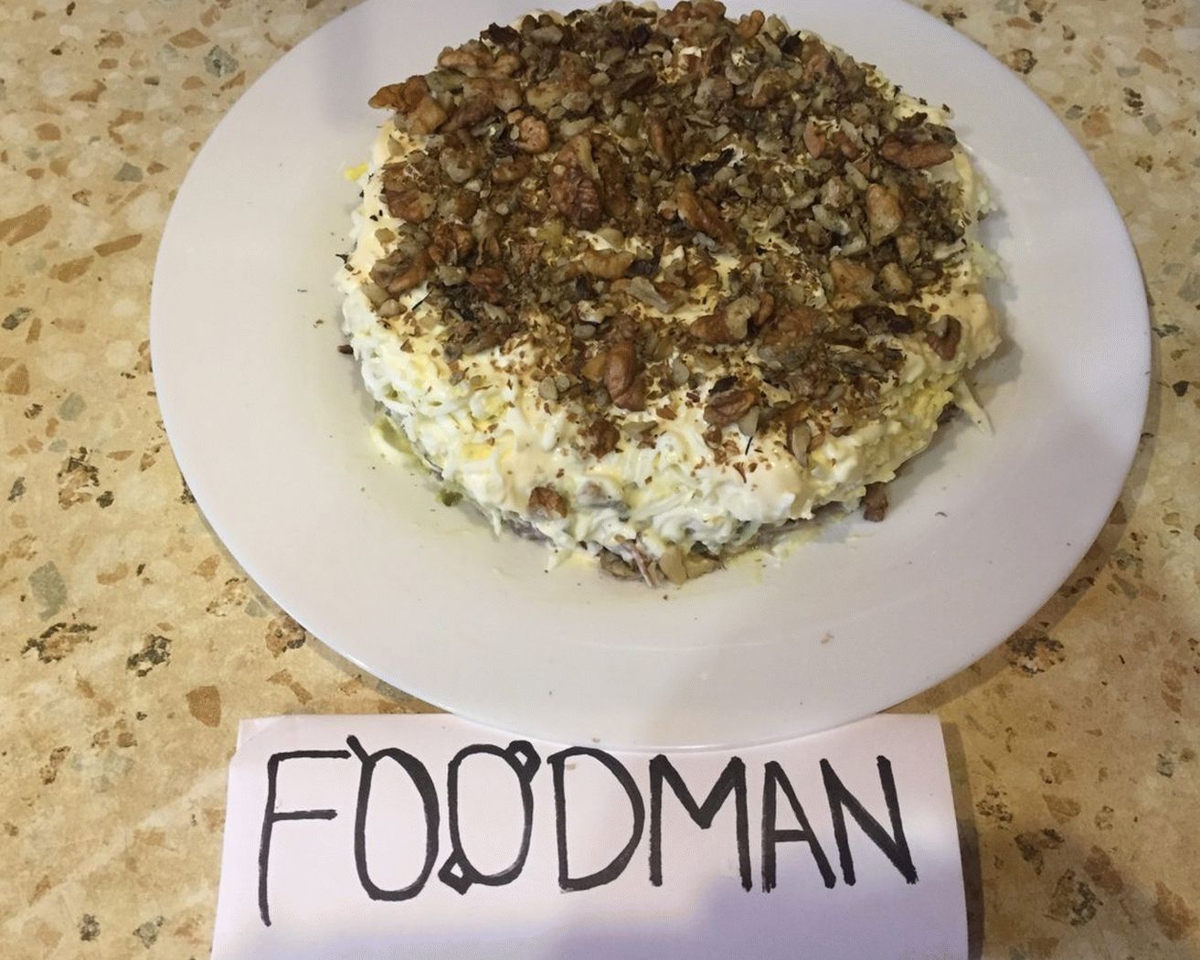 - Положите салату у слојевима: месо, мајонез, краставци + бели лук, мајонез, јаја, мајонез, ораси (део сам ситно исецкао, ситно и део остављен у комадима).