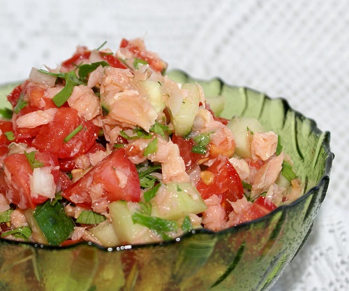 Салата с поврћем и димљеним ружичастим лососом је интригантан укус и минимално калорија. Јело се лако припрема код куће.