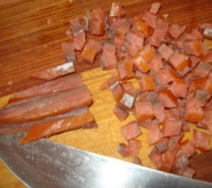 Димљени ружичасти лосос да би се извадио из костију и исекао на ситне комада.