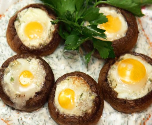 Печене гљиве ставите на подмазани лим за печење. Уредно разбити препеличја јаја и сипати њихов садржај у свако шешир.