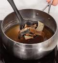 - Напуните гљиве 15 минута топлом водом за пиће (5 шољица), довести до кључања и кухати 10 минута. Затим извадите шампињоне, ситно исјецкати (њежно, вруће су!) и вратити у јуху.