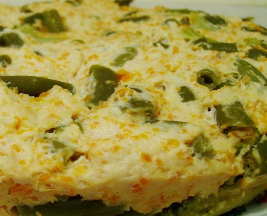 - У већу чинију ставите резанци, шаргарепу и пасуљ. Сипати мешавина јаја. Промените. Ставити у намашћен облик. Поспите друга половина нарибаног сира. Ставите танке кришке на врх путер.