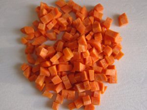 - Мркву нарежите на мале коцкице. Ставите у тепсију. Сипати воде, тако да се шаргарепа једва прекрила водом. Кувајте 5 минута ниска топлота.